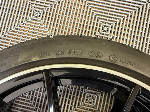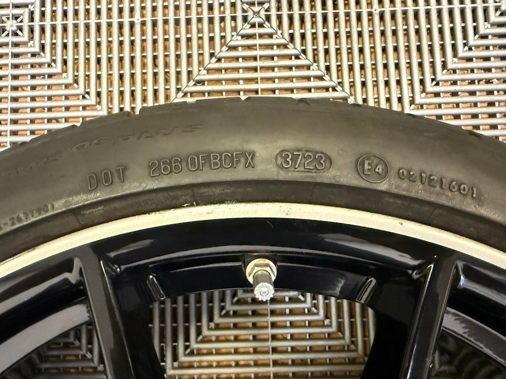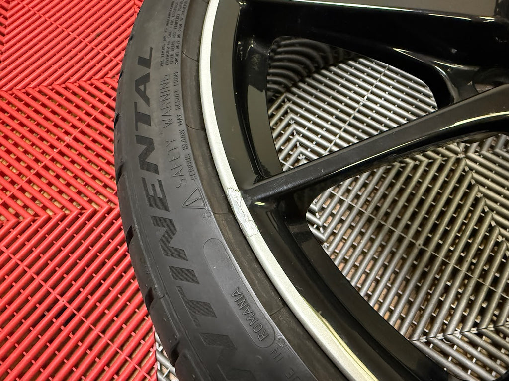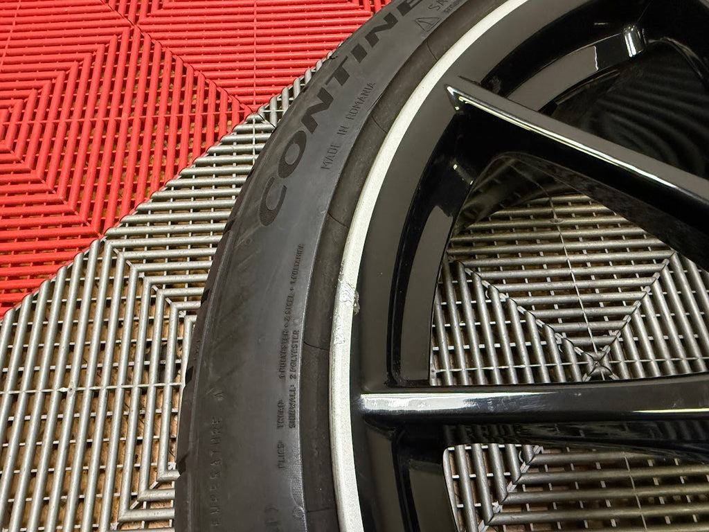 Wheels are wrapped in like new Continental DWS 06 Plus tires. 2023 and 2024 date codes on the tires. All 4 tires have full tread remaining at 11/32". These were either driven on minimally, or possibly not driven on at all. Nibs from the factory can still be seen on some parts of the tread surface.