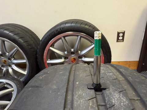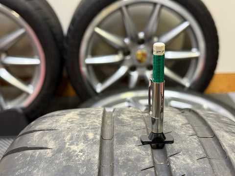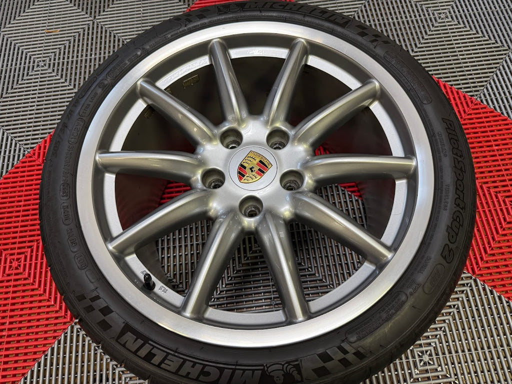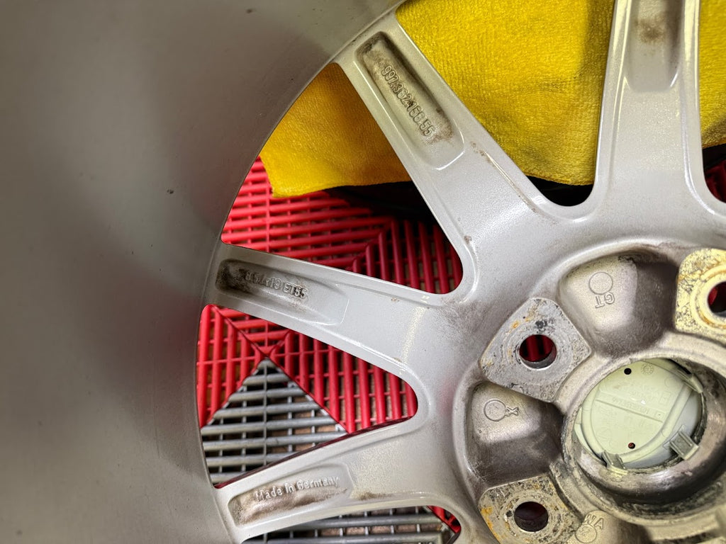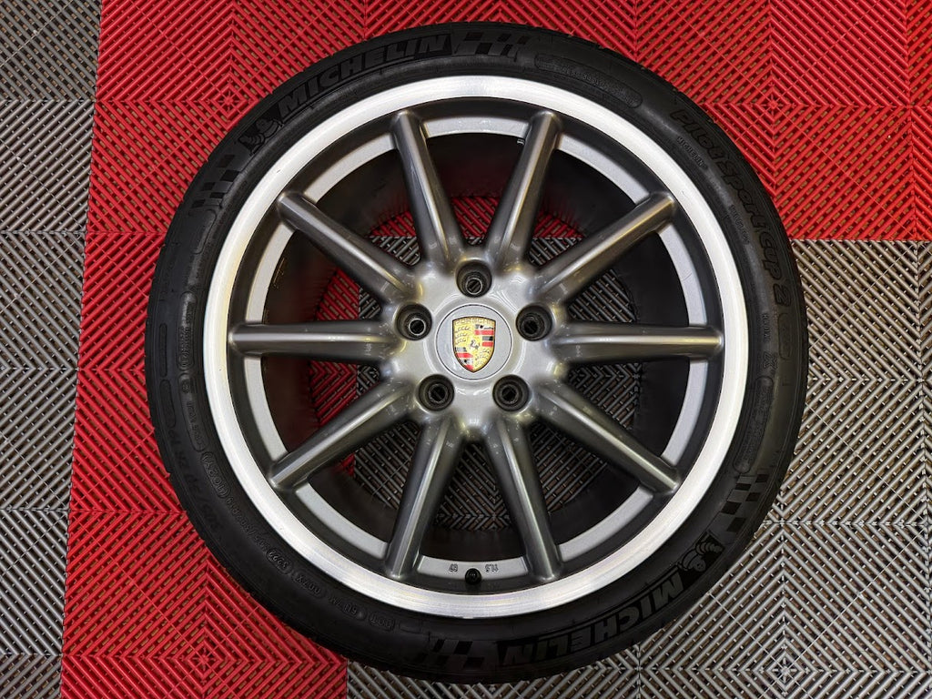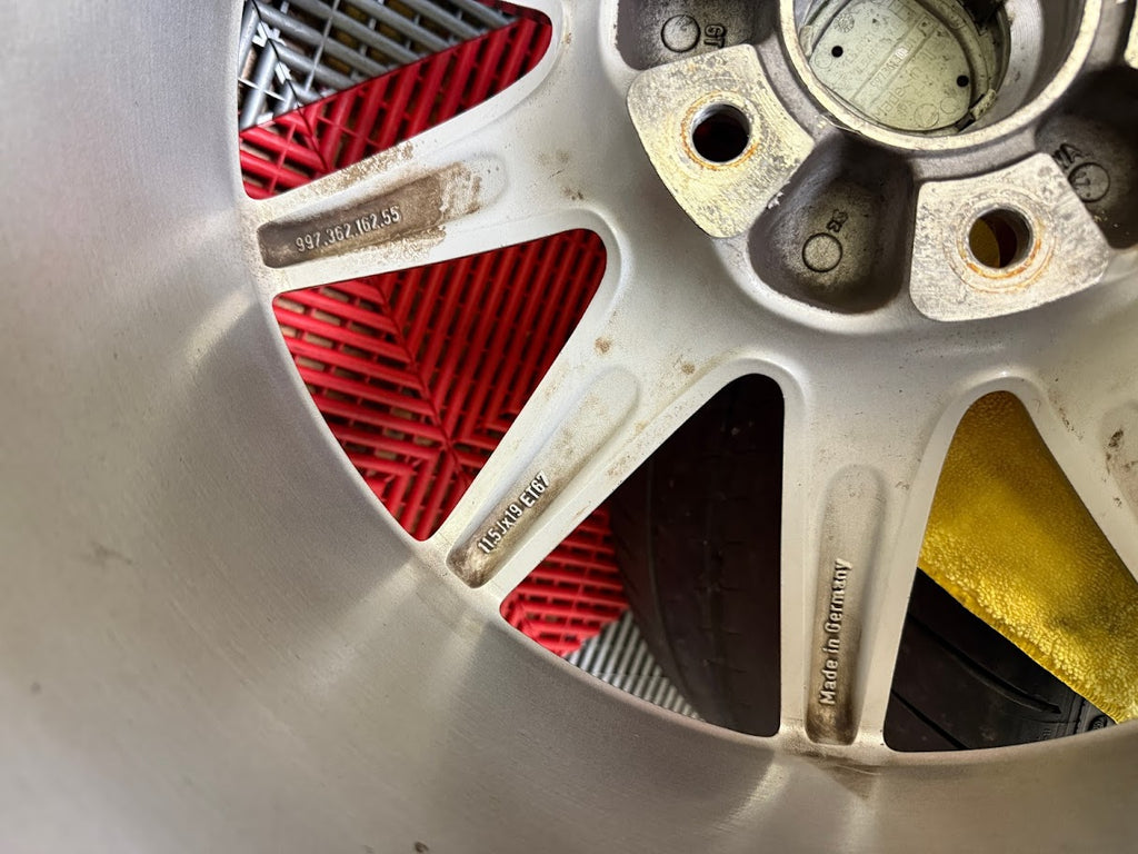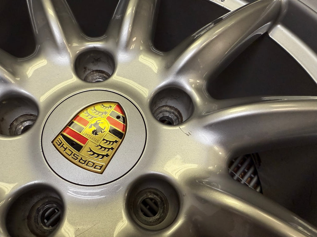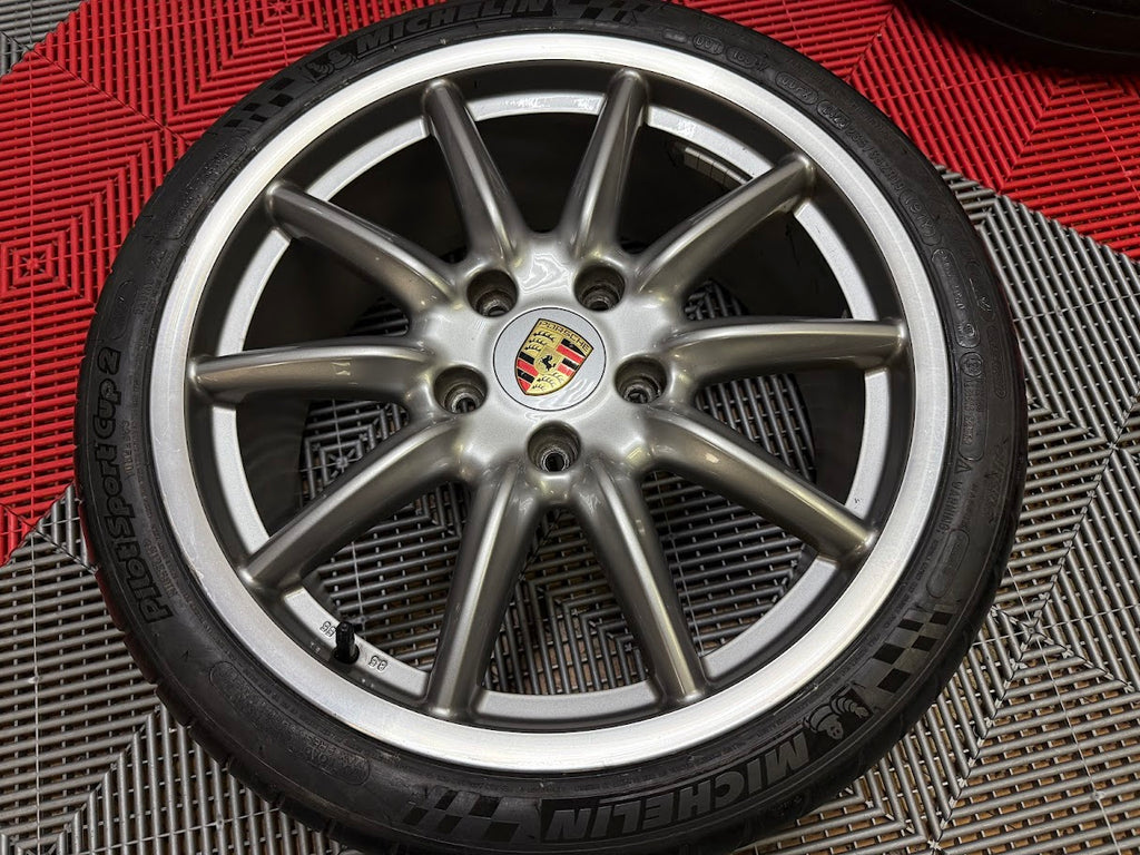 Cosmetically wheels are an 8.5/10 overall. One rear wheel has been previously refinished. Original Porsche factory finish on 3 of the wheels. Some small chips, scratches, scuffs and nicks from normal use. Inner wheel barrels show some minor brake dust and dirt residue.