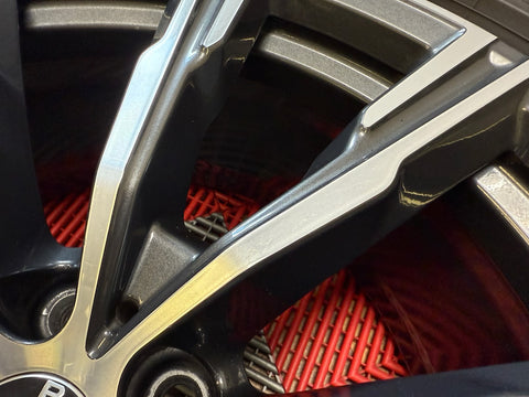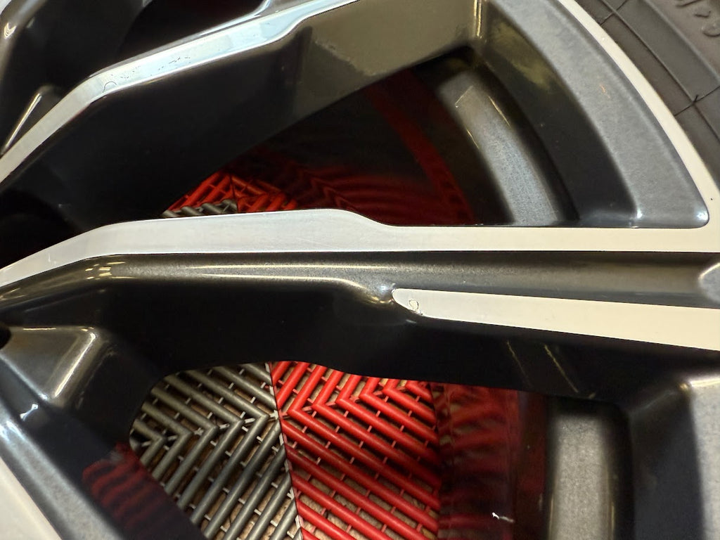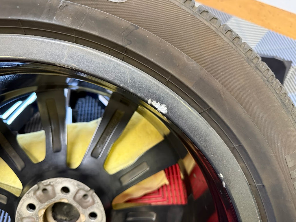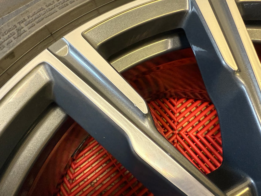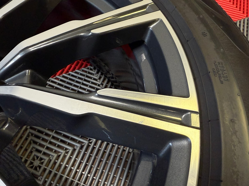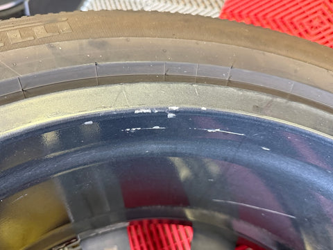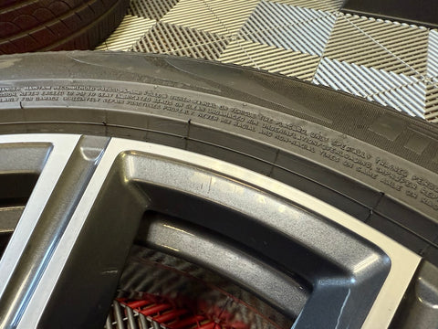 Cosmetically wheels are a 8.5/10. No visible curb rash, but one wheel has an area where some minor curb rash has been blended smooth and polished. Faces show some small scratches, nicks and tiny chips from normal use. Tires are Faces may have a few superficial marks from handling. Backside and inner barrels of the wheels show some small chips and marks.