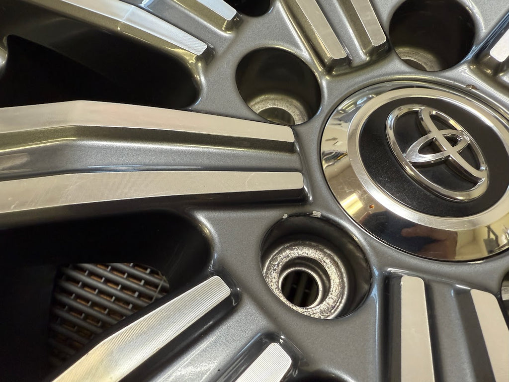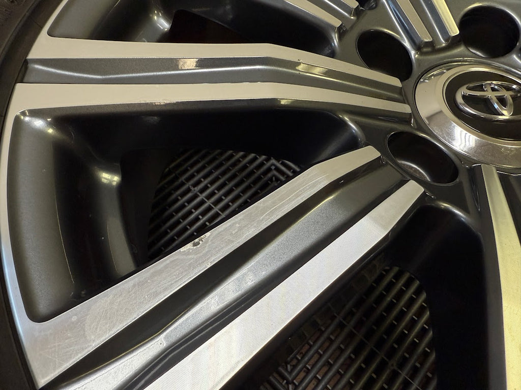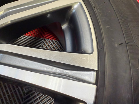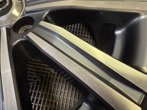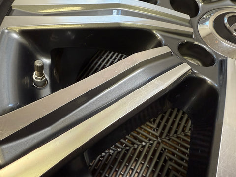 All 4 wheels are verified to be straight and true, and free of cracks, bends or prior repairs. Cosmetically the wheels are an 8/10 overall. No curb rash. One wheel has some chipping finish in the center from a wheel balancing machine. Some small nicks, scratches and scuffs throughout from normal use.