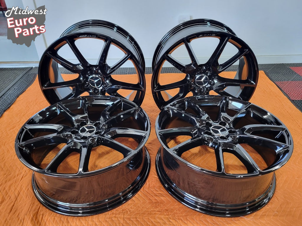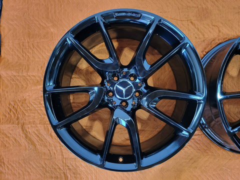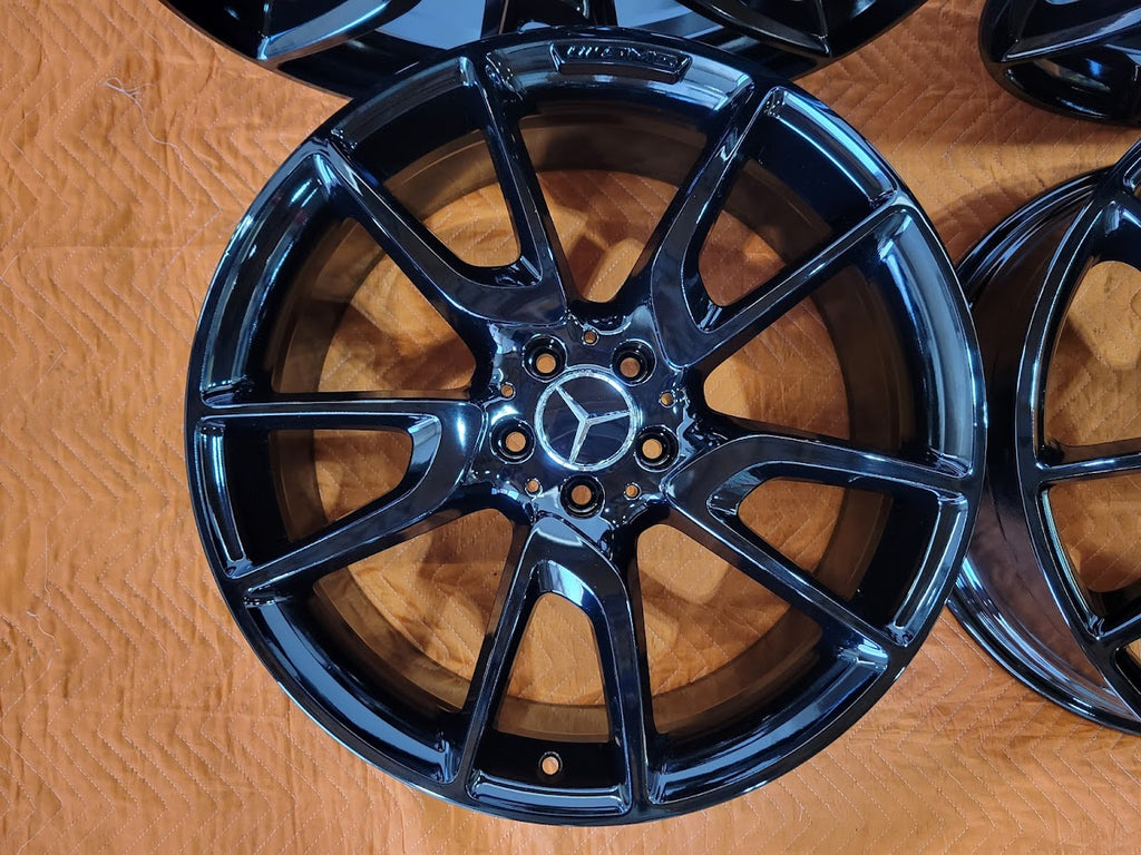 Up for sale is a set of OEM 21" Mercedes GLC43 AMG wheels. Genuine Mercedes wheels, not aftermarket reproductions. Professionally refinished in a gloss black powder coated finish.