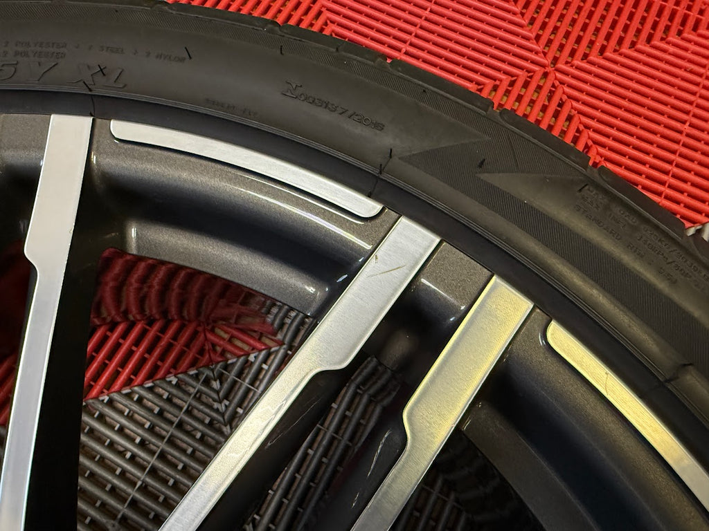 Wheels are verified to be straight and true, and free of cracks, bends or prior repairs. Cosmetically wheels are an 8/10 overall. Original factory finish - wheels have not been refinished. Wheels have no visible curb rash, but there are some areas where minor curb rash has been blended smooth. Some small chips, nicks, scuffs and scratches from normal use.