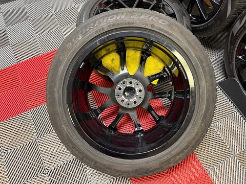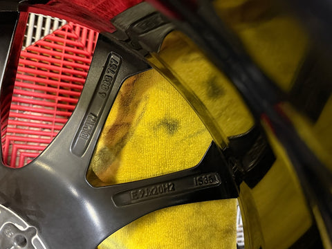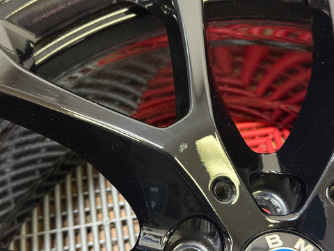 Cosmetically wheels are in 9/10 condition. Previous owner had the wheels painted (not powder coated) gloss black. Finish shows some minor scratches, light swirl marks and small chips. A few of the scratches and chips have been touched up. Inner wheel barrels show some light pitting from brake dust and dirt residue.